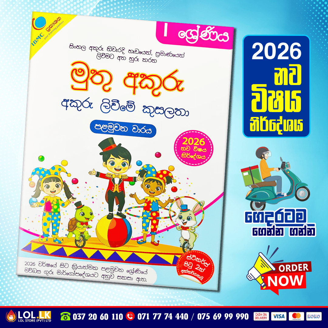 Buy Grade 01 Muthu Akuru – Akuru Livime Kusalatha workbook for Sinhala Medium students (Muthu Akuru Publication). Prepared in accordance with the new syllabus for the First terms. මුතු අකුරු – අකුරු ලිවීමේ කුසලතා පොත (පළමුවන වාරය) 2026 වර්ෂයේ සිට ක්රියාත්මක පළමුවන ශ්රේණියේ මව්බස ගුරු මාර්ගෝපදේශයට අනුව සකසා ඇති 2026 නව විෂය නිර්දේශිත පොතකි.