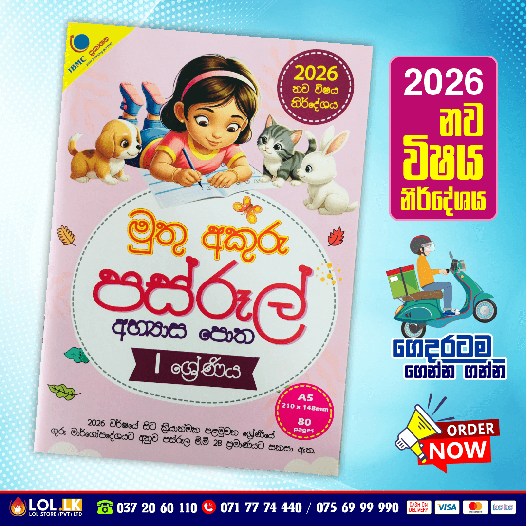 Buy Grade 01 Muthu Akuru – Pasrool Workbook (01) for Sinhala Medium students (Muthu Akuru Publication). Prepared in accordance with the new syllabus. මුතු අකුරු – පස්රූල් අභ්යාස පොත (01). 2026 වර්ෂයේ සිට ක්රියාත්මක පළමුවන ශ්රේණියේ මව්බස ගුරු මාර්ගෝපදේශයට අනුව සකසා ඇති 2026 නව විෂය නිර්දේශිත පොතකි.