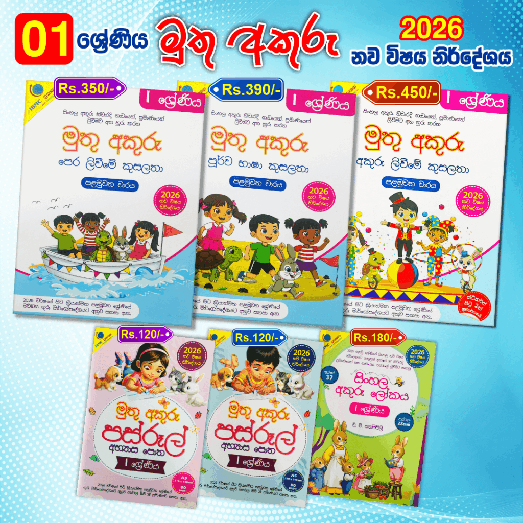 Buy Grade 01 Muthu Akuru – Pera Livime Kusalatha workbook for Sinhala Medium students (Muthu Akuru Publication). Prepared in accordance with the new syllabus for the First terms. මුතු අකුරු අකුරු ලිවීමේ කුසලතා පොත (පළමුවන වාරය) 2026 වර්ෂයේ සිට ක්රියාත්මක පළමුවන ශ්රේණියේ මව්බස ගුරු මාර්ගෝපදේශයට අනුව සකසා ඇති 2026 නව විෂය නිර්දේශිත පොතකි.