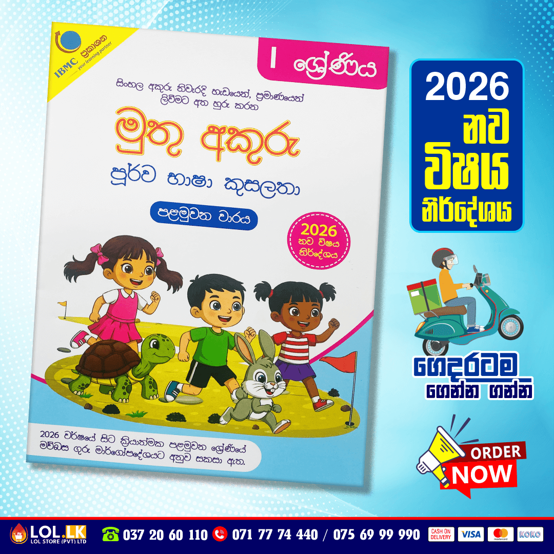 Buy Grade 01 Muthu Akuru – Purwa Bhasha Kusalatha workbook for Sinhala Medium students (Muthu Akuru Publication). Prepared in accordance with the new syllabus for the First terms. මුතු අකුරු – පූර්ව භාෂා කුසලතා පොත (පළමුවන වාරය) 2026 වර්ෂයේ සිට ක්රියාත්මක පළමුවන ශ්රේණියේ මව්බස ගුරු මාර්ගෝපදේශයට අනුව සකසා ඇති 2026 නව විෂය නිර්දේශිත පොතකි.