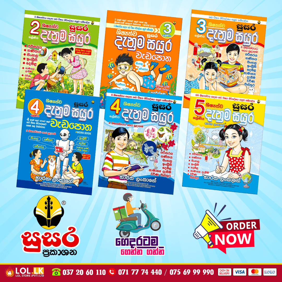 Buy Grade 02 Susara – Shishshathwa Denum Sayura book for Sinhala Medium students (Muthu Akuru Publication). 5 වසර ශිෂ්යත්වය සදහා නව විෂය නිර්දේශය අනුව සම්පාදිත ශිෂ්යත්ව දැනුම් සයුර පොත පරිසරය, ගණිතය, සිංහල, ඉංග්රීසි, දෙමළ, සාමාන්ය දැනීම, වර්ණ පින්තූර යන සියලු විෂය දැනුම එකම පොතකින් ලබා ගත හැකිය.