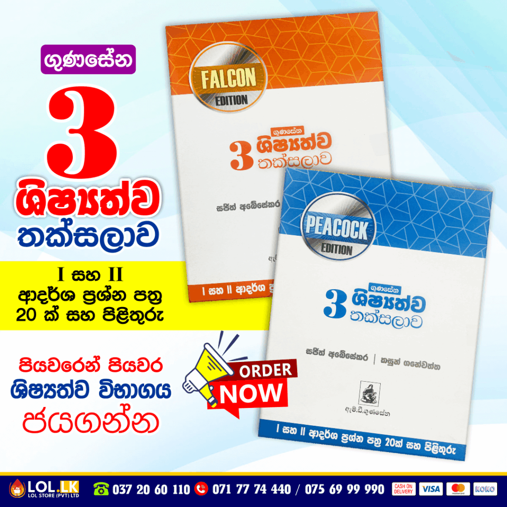 Buy Grade 03 M.D. Gunasena – Shishshathwa Thaksalawa (Falcon Edition) Model Paper Book for Sinhala Medium students (M.D. Gunasena Publication). 3 ශ්රේණිය ශිෂ්යත්ව තක්සලාව. පියවරෙන් පියවර ශිෂ්යත්ව විභාගය ජයගන්න I සහ II ආදර්ශ ප්රශ්න පත්ර 20 ක් සහ පිළිතුරු සමගින්.