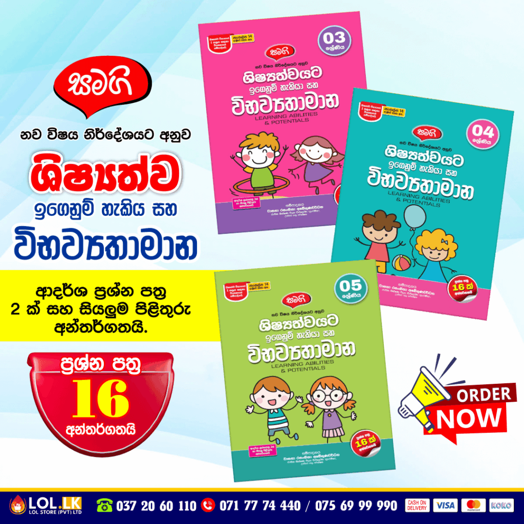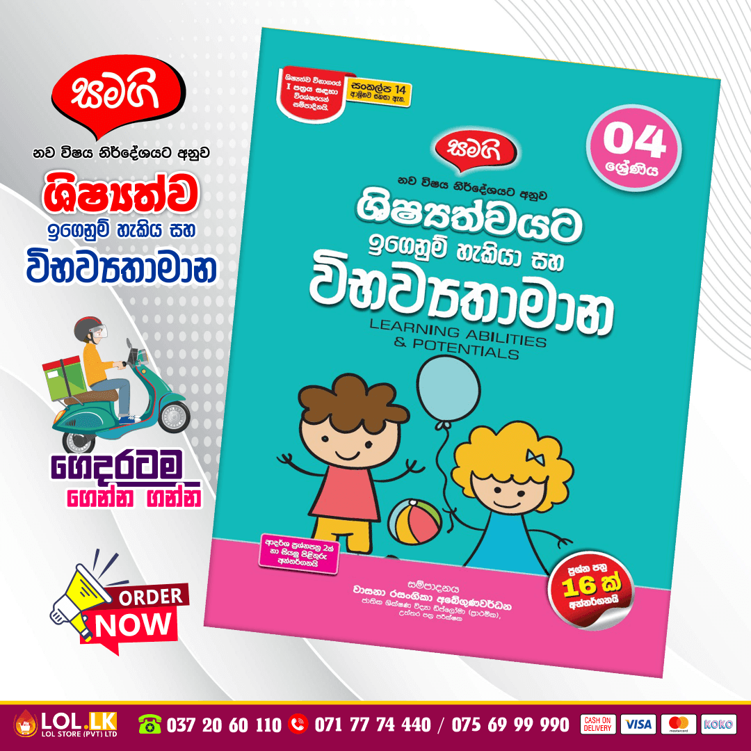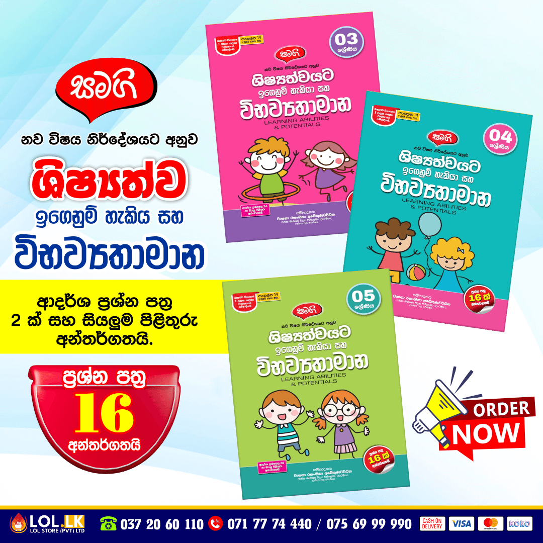 Buy Grade 04 Samagi – Shishshathwa Denum Sayura Workbook for Sinhala Medium students (Samagi Publication). 04 ශ්රේණිය සමගි පොත් ප්රකාශන නව විෂය නිර්දේශයට අනුව ශිෂ්යත්වයට ඉගෙනුම් හැකියා සහ විභව්යතාමාන. ප්රශ්න පත්ර 16 ක සහ ආදර්ශ ප්රශ්න පත්ර දෙකක් සහ සියලුම පිළිතුරු අන්තර්ගතයි.