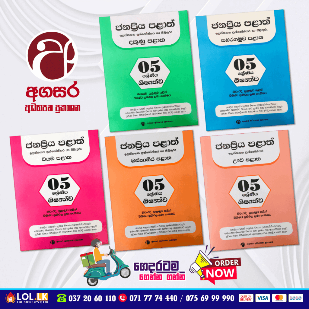 Buy Grade 5 Sabaragamuwa Province Target Questions and Answers Paper Book. 05 ශ්රේණිය ශිෂ්යත්ව – සබරගමුව පළාත් ඉලක්ක ප්රශ්නෝත්තර හා පිළිතුරු. ජනප්රිය පළාත් පසුගිය විභාග ප්රශ්න පත්ර වලට සමගාමීව ශිෂ්යත්ව විභාග නව ප්රශ්න පත්ර ආකෘතිය අනුව පූර්ණ විෂය නිර්දේශයම ආවරණය වන පරිදි සකසා ඇත.