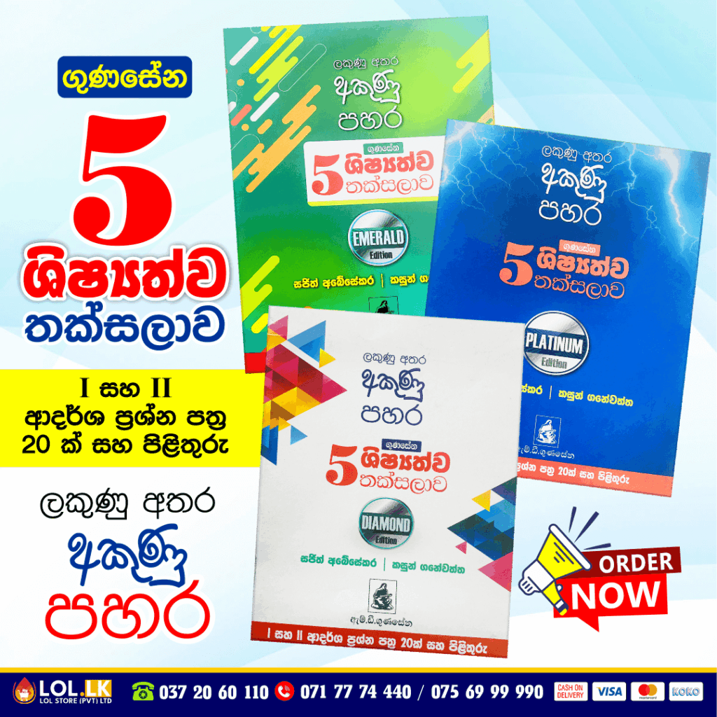 Buy Grade 05 M.D. Gunasena – Shishshathwa Thaksalawa (Diamond Edition) Model Paper Book for Sinhala Medium students (M.D. Gunasena Publication). 5 ශ්‍රේණිය ලකුණු අතර අකුණු පහර  ශිෂ්‍යත්ව තක්සලාව පොත පියවරෙන් පියවර ශිෂ්‍යත්ව විභාගය ජයගන්න I සහ II ආදර්ශ ප්‍රශ්න පත්‍ර 20 ක් සහ පිළිතුරු සමගින්.
