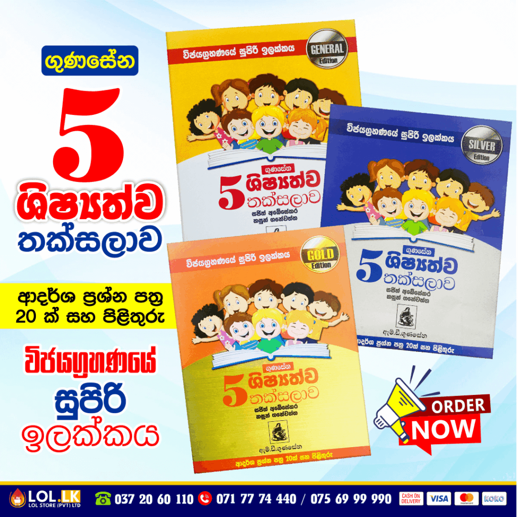 Buy Grade 05 M.D. Gunasena – Shishshathwa Thaksalawa (Gold Edition) Model Paper Book for Sinhala Medium students (M.D. Gunasena Publication). 5 ශ්‍රේණිය විජයග්‍රහණයේ සුපිරි ඉලක්කය ශිෂ්‍යත්ව තක්සලාව පොත පියවරෙන් පියවර ශිෂ්‍යත්ව විභාගය ජයගන්න I සහ II ආදර්ශ ප්‍රශ්න පත්‍ර 20 ක් සහ පිළිතුරු සමගින්.