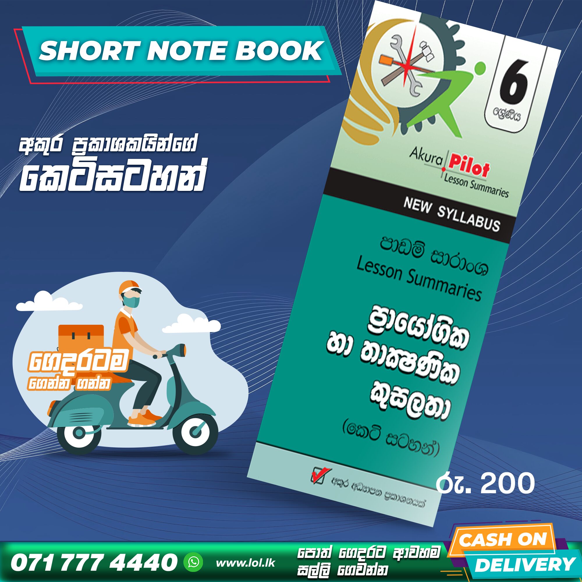 නව විෂය නිර්දේශය 06 ශ්රේණිය ප්රයෝගික තාක්ෂණ කුසලතා කෙටිසටහන් පොත. මෙම කෙටිසටහන් සකස් කිරීමේදී ශිෂයන් ඉගෙන ගත යුතු විෂය කරුණු සියල්ල පැහැදිලිව හා ක්රමානුකූලව පෙළගස්වා ඇති අතර, එමගින් විභාගවලට පිළිතුරු ලිවීමේදී අවශ්ය වන කරුණු ඉක්මණින් වටහා ගැනීමට සහ මතකයට නගා ගැනීමට හැකි වනු ඇත.