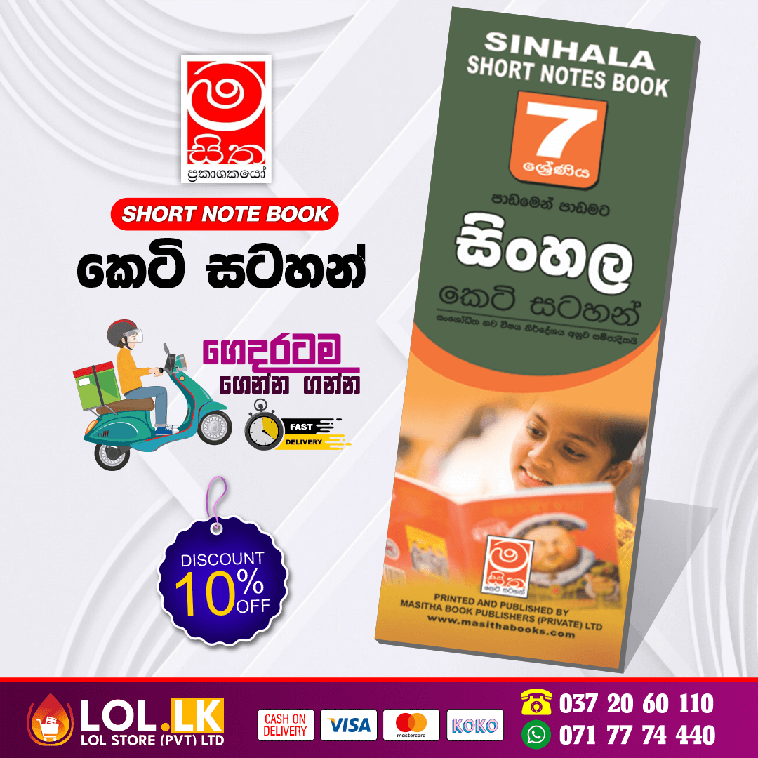 Buy Grade 07 Sinhala Short Notes Book in Sinhala medium. This book is prepared according to the new Grade 07 syllabus and is ideal for quick revision and easy understanding. Fast delivery available. සිංහල මාධ්ය සිසුන් සඳහා විශේෂයෙන් සකස් කළ 07 ශ්රේණිය නව විෂය නිර්දේශයට අනුව ඇති සිංහල කෙටි සටහන් පොත.
