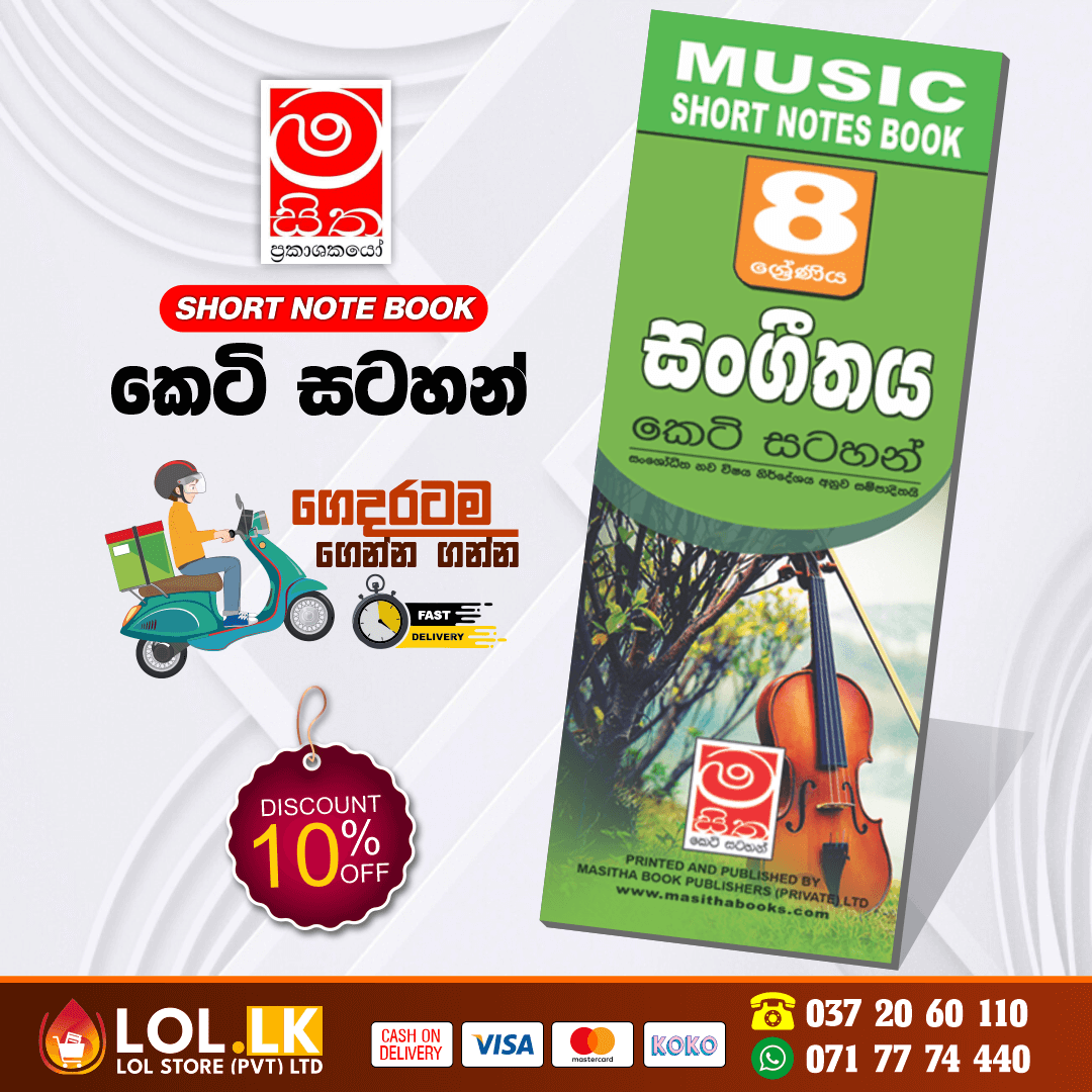 නව විෂය නිර්දේශය 08 ශ්රේණිය සංගීතය කෙටිසටහන් පොත. මෙම කෙටිසටහන් සකස් කිරීමේදී ශිෂයන් ඉගෙන ගත යුතු විෂය කරුණු සියල්ල පැහැදිලිව හා ක්රමානුකූලව පෙළගස්වා ඇති අතර, එමගින් විභාගවලට පිළිතුරු ලිවීමේදී අවශ්ය වන කරුණු ඉක්මණින් වටහා ගැනීමට සහ මතකයට නගා ගැනීමට හැකි වනු ඇත.