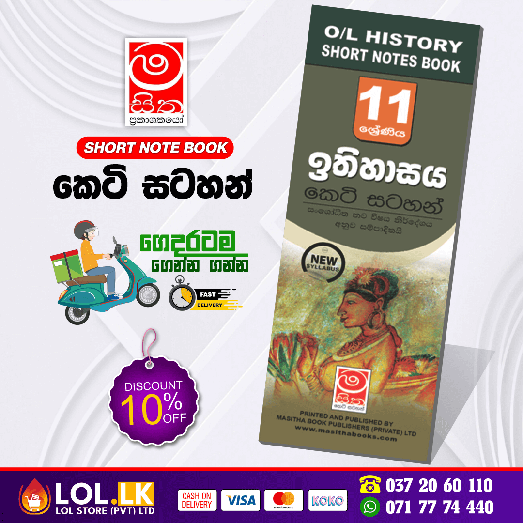 නව විෂය නිර්දේශය 11 ශ්රේණිය ඉතිහාසය කෙටිසටහන් පොත. මෙම කෙටිසටහන් සකස් කිරීමේදී ශිෂයන් ඉගෙන ගත යුතු විෂය කරුණු සියල්ල පැහැදිලිව හා ක්රමානුකූලව පෙළගස්වා ඇති අතර, එමගින් විභාගවලට පිළිතුරු ලිවීමේදී අවශ්ය වන කරුණු ඉක්මණින් වටහා ගැනීමට සහ මතකයට නගා ගැනීමට හැකි වනු ඇත.