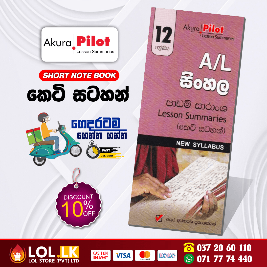 Buy Akura Publication Grade 12 Sinhala Language Short Note Book එක 12 ශ්රේණියේ සිසුන්ට සිංහල භාෂාව හා ව්යාකරණය සරලව සහ ක්රමවත්ව ඉගෙන ගැනීමට උපකාර වන Short Notes, Grammar Rules, Important Concepts සහ Lesson Summaries එකතුවක් ලෙස නිර්මාණය කර ඇත. මෙම පොත තුළ Sinhala language syllabus අනුව අවශ්ය ව්යාකරණ නීති, භාෂා සංකල්ප සහ වැදගත් කරුණු සරල සහ පැහැදිලි ආකාරයෙන් ඉදිරිපත් කර ඇත. එමඟින් සිසුන්ට පාඩම් ඉක්මනින් පුනරීක්ෂණය (Quick Revision) කර ගැනීමට සහ Term Tests සහ School Exams සඳහා සූදානම් වීමට පහසු වේ.