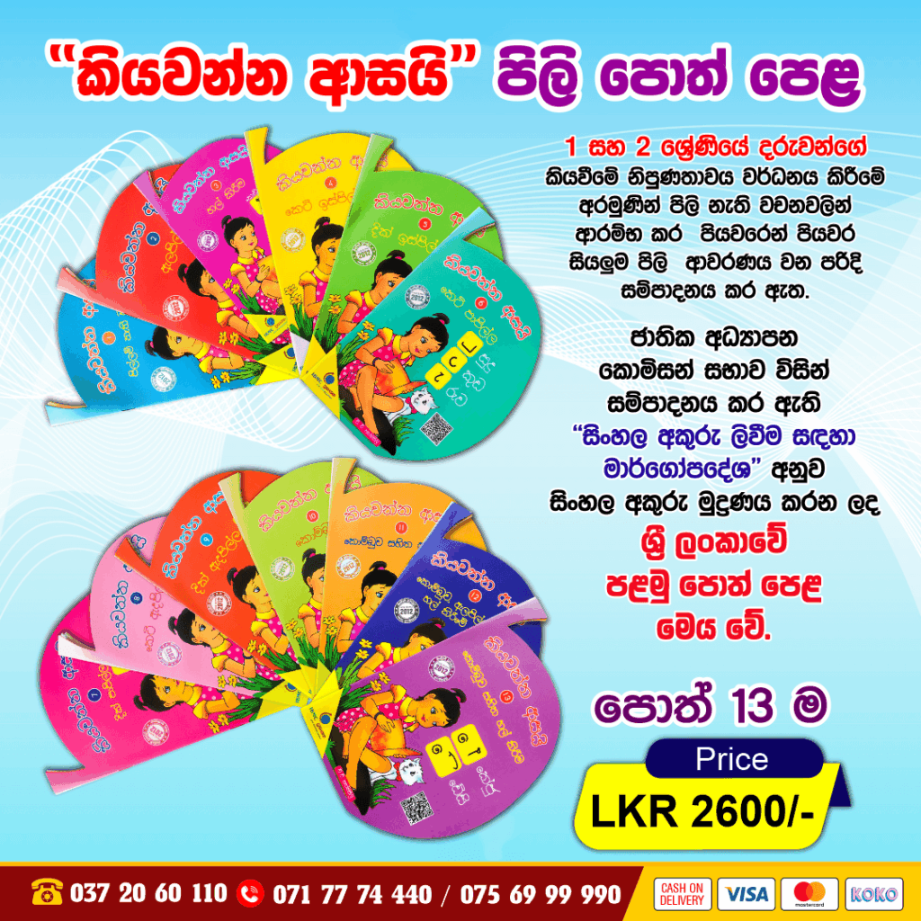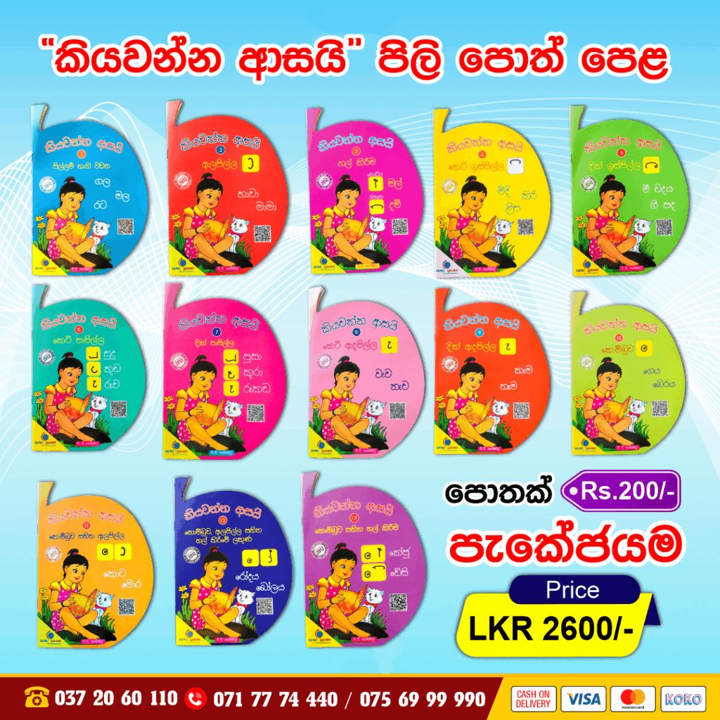 | Book Name | කියවන්න ආසයි පොත් පැකේජය, පිල්ලම් නැති වචන, ඇලපිල්ල, හල් කිරීම, කෙටි ඉස්පිල්ල, දික් ඉස්පිල්ල, කෙටි පාපිල්ල, දික් පාපිල්ල, කෙටි ඇදපිල්ල, දික් ඇදපිල්ල, කොම්බුව, කොම්බුව සහිත ඇලපිල්ල, කොම්බුව, ඇලපිල්ල සහිත හල් කිරීමේ ලකුණ, කොම්බුව සහිත හල් කිරීමේ ලකුණ |