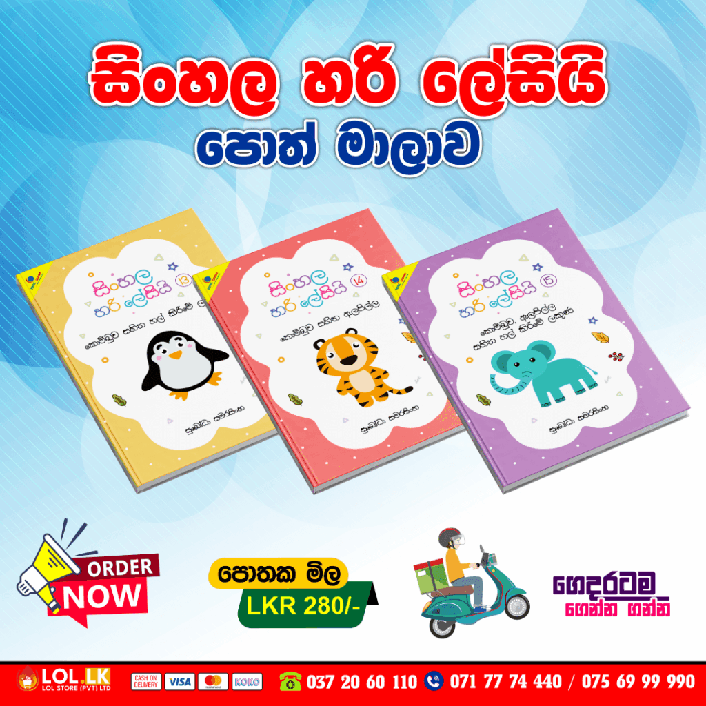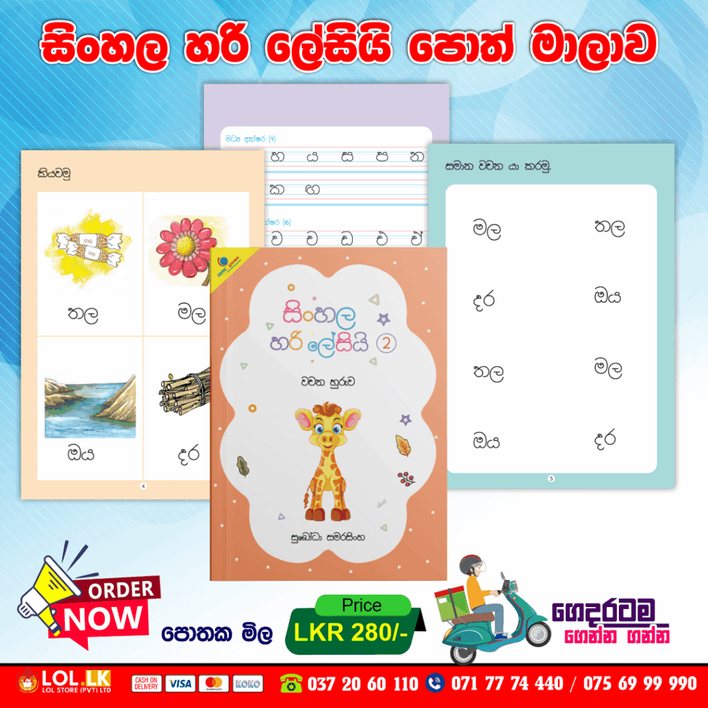 | Book Name | සිංහල හරි ලේසියි පොත් පැකේජය, වචන හුරුව 01, වචන හුරුව 02, වචන හුරුව 03, හල් කිරීමේ ලකුණ, ඇලපිල්ල, කෙටි ඇදපිල්ල, දික් ඇදපිල්ල, කෙටි ඉස්පිල්ල, දික් ඉස්පිල්ල, කෙටි පාපිල්ල, දික් පාපිල්ල, කොම්බුව, කොම්බුව සහිත හල් කිරීමේ ලකුණ, කොම්බුව සහිත ඇලපිල්ල, කොම්බුව, ඇලපිල්ල සහිත හල් කිරීමේ ලකුණ |